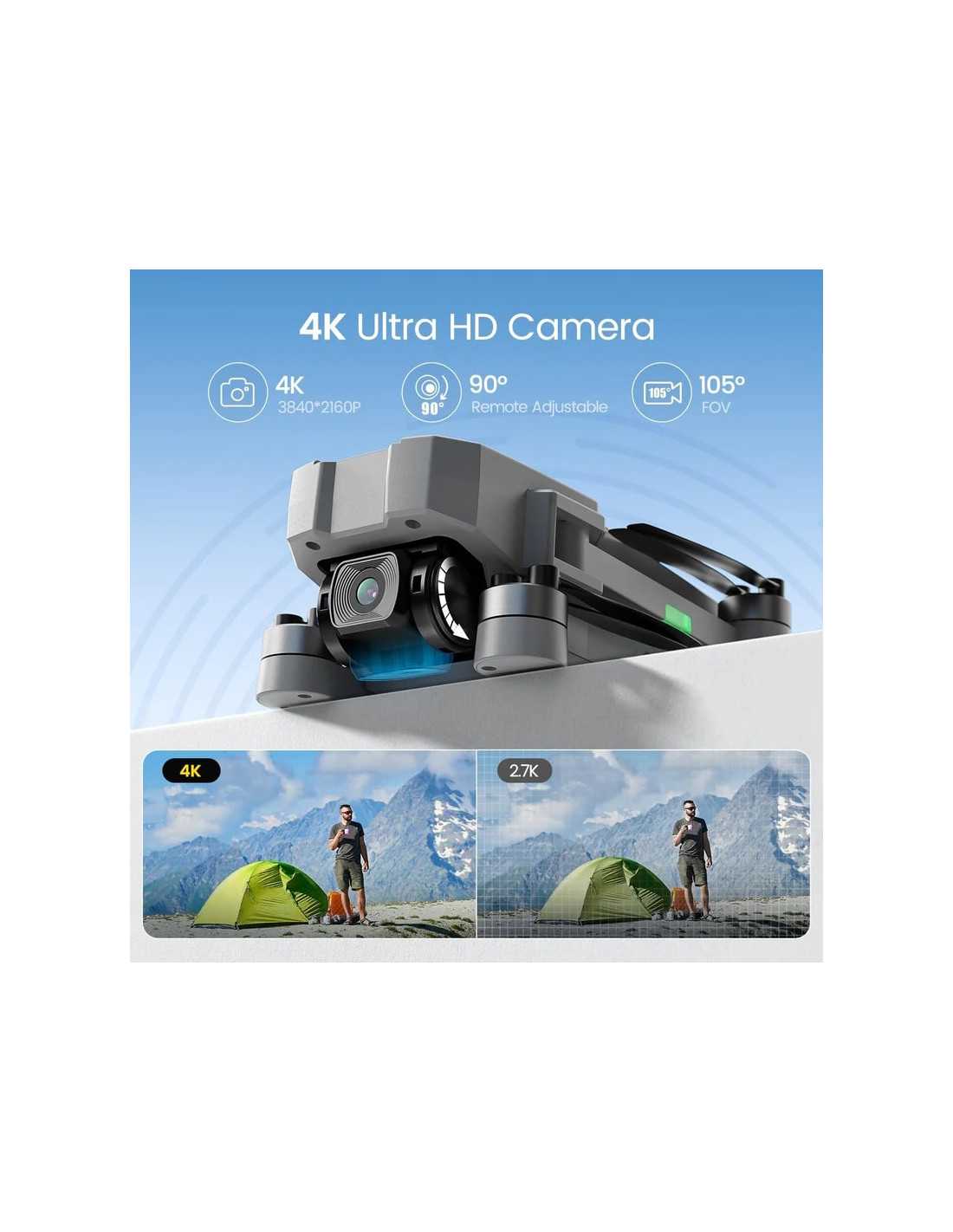 Optagelser i Biografkvalitet med Fuld Kontrol Udstyret med et skarpt 4K-kamera fanger HS440G verden i levende detaljer og rige farver. Takket være 5G Wi-Fi-transmissionen får du et stabilt og klart live-billede direkte på din telefon. Kameraets 105° vidvinkel fanger brede landskaber, og med den 90° motoriserede justering kan du lynhurtigt skifte perspektiv fra horisonten til direkte under dronen, hvilket giver uendelige kreative muligheder.