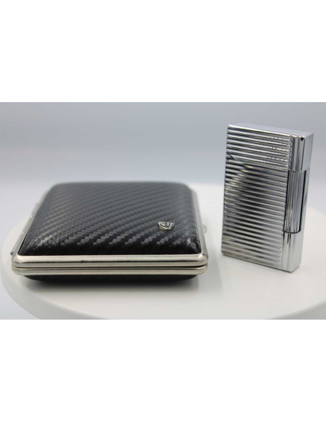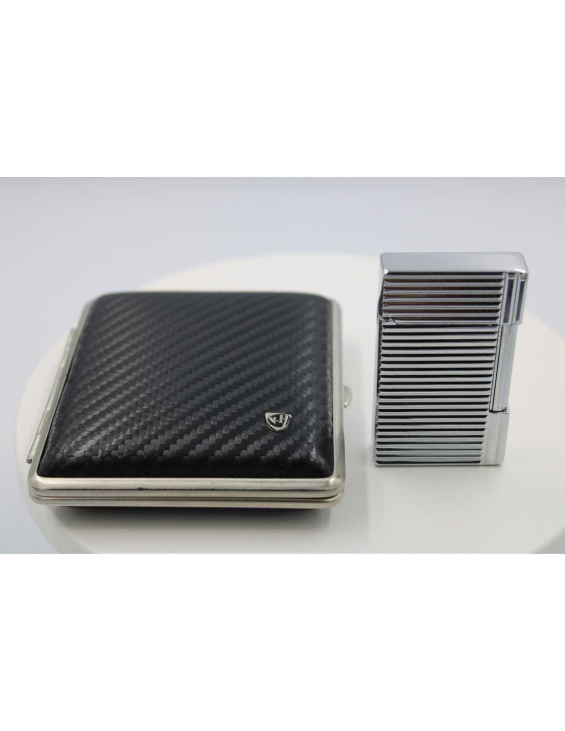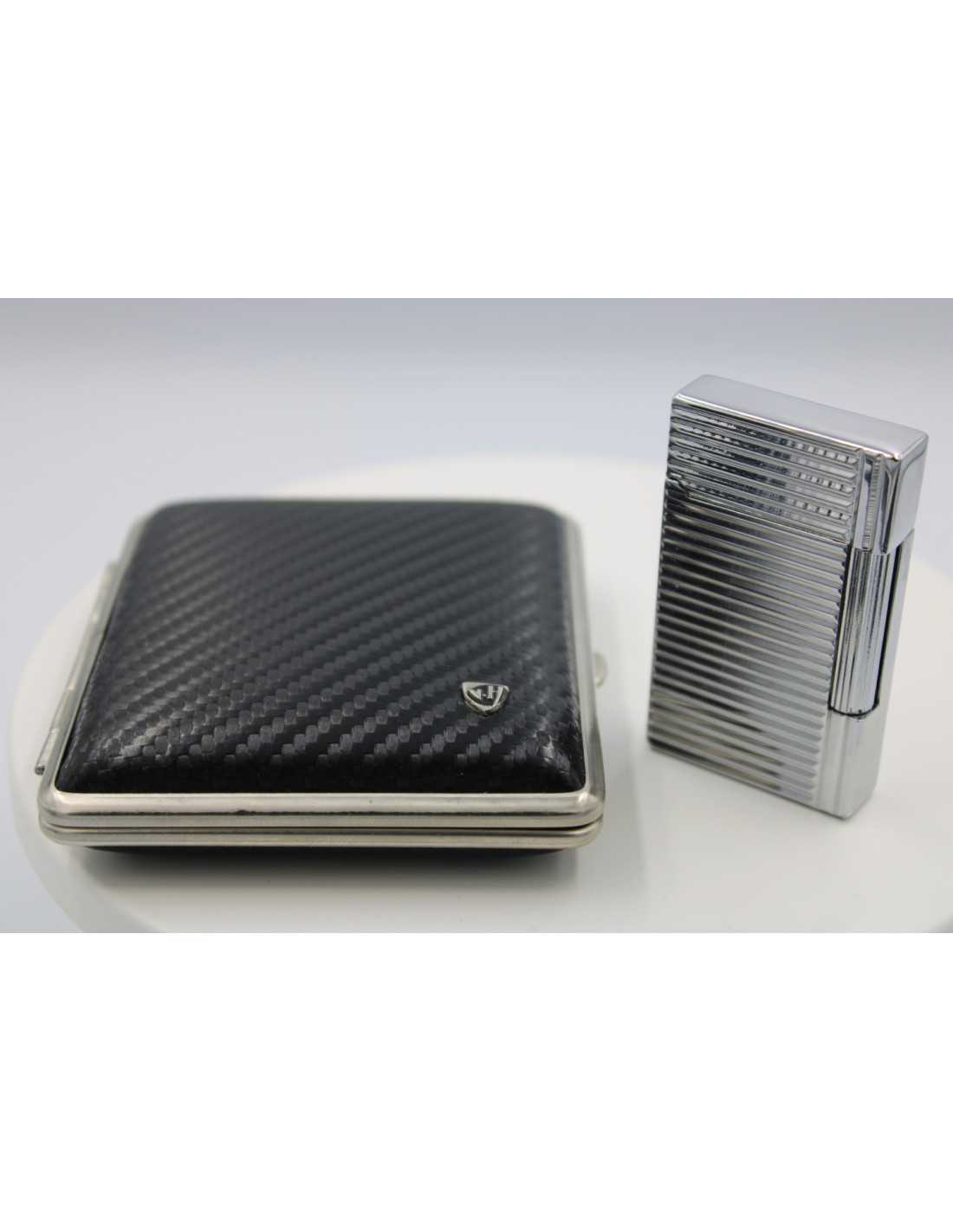 Dette eksklusive sæt inkluderer Jean Claude "Dustin" flint lighter sort/sølv og Vom Hofe cigaret etui sort/sølv i ægte læder.