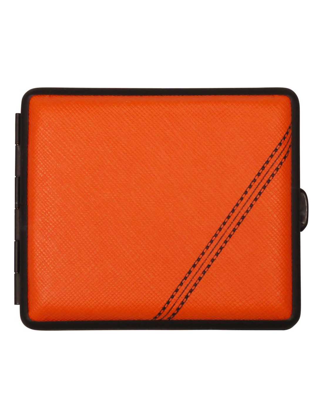 Vom Hofe cigaret etui i imiteret læder i sort og orange med plads til 18 cigaretter. Vom Hofe producerer eksklusive luksus cigaret etuier i de bedste materialer fra deres hovedsæde i Tyskland.