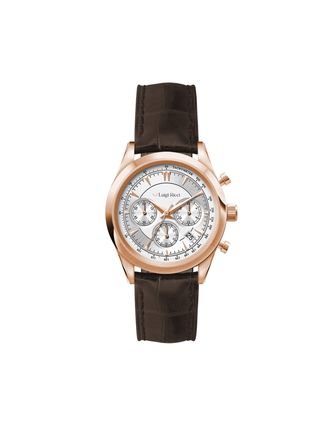 Vi introducerer Luigi Riccis seneste luksusur til kvinder, der kommer til en fair pris - Luigi Ricci Eleganza X11. Dette ur til kvinder er centreret omkring et Japan Miyota FS20 chrono date (CITIZEN) urværk i høj kvalitet, en flot sølvskive, en rosa guld case og en elegant brun læderrem med alligatormønster. Med Eleganza X11s klassiske look, rosa guld case og sporty finnish, har Luigi Ricci skabt et moderigtigt ur der kan anvendes til alle lejligheder.